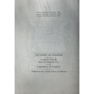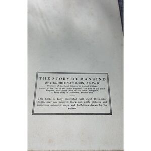 The Story of Mankind by HENDRIK VAN LOON (1922) 1st Edition, Third Printing. Some tanning from age. Binding is solid. Picture on front is peeling.