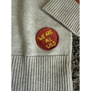 Cotton pullover has a bold, 3 color stripe print across the chest and sleeves. Paired with a bright orange elbow cover and a patch that reads "We Are All Wild", there's so much about this sweater that'll make you feel unique while wearing it. Striped chest and sleeves. Elbow Patch. Emblem Patch.