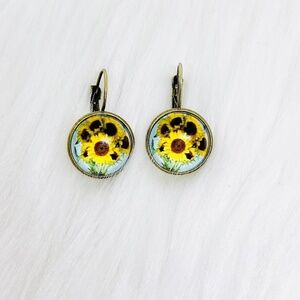 These Vintage like Sunflower Print Earrings are the perfect addition to your jewelry collection. Crafted from copper and glass, they feature a beautiful sunflower image with a vintage feel. Measuring 1.18" long, these earrings are sure to make a statement.