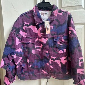 The Sunset & Spring denim jacket in pink and purple camouflage is a stylish and eye-catching piece. Made from comfortable cotton fabric, this jacket features a trendy camouflage pattern in vibrant shades of pink and purple. It has a short length with long sleeves and a dropped shoulder design, adding a modern touch to your outfit12. Perfect for making a bold fashion statement while staying cozy!