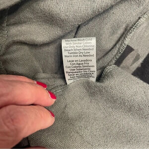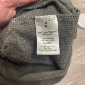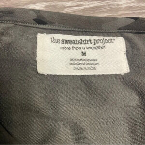 Comfy cozy top from The Sweatshirt Project. Green and black camouflage print with a ruffled bottom edge and short cuffed sleeves. Material is thicker than a t-shirt but thinner than a sweatshirt.