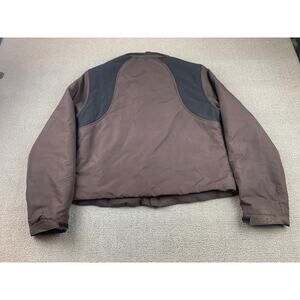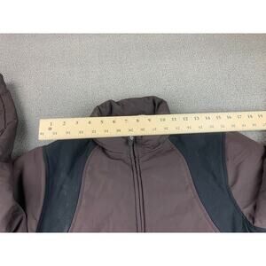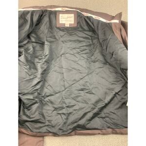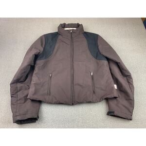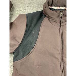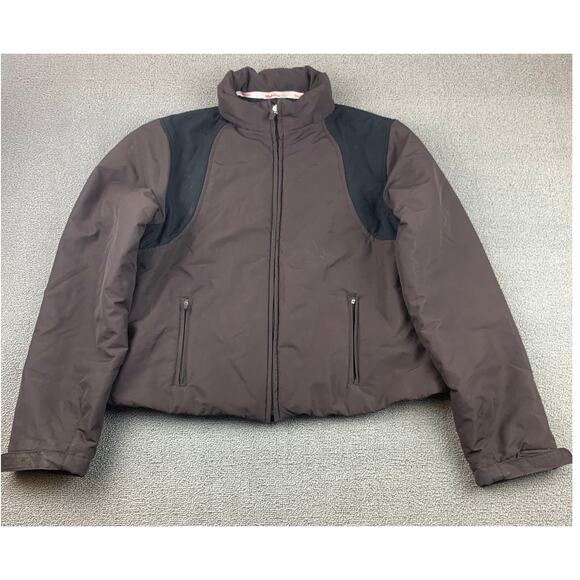 Stylish brown jacket with black accents. Features a zip front and two pockets. Perfect for cool weather.