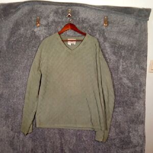 Embrace timeless style with this green V-neck sweater from The Territory Ahead, featuring a classic knit pattern and ribbed cuffs for a comfortable fit. Its muted green hue offers versatility, making it an essential piece for any casual wardrobe. it in good condition..no flaws noted. measurements are in the listing