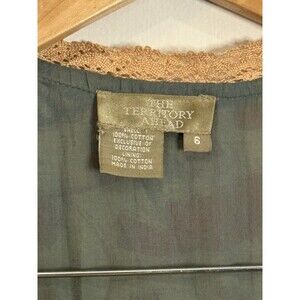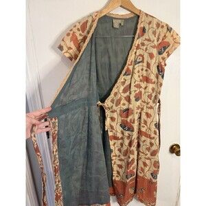 The Territory Ahead Women's Wrap Dress in size 6 features a leaf print in a paisley pattern, short sleeves, a V-neckline, and a tie closure. Made of cotton, this knee-length dress is perfect for casual or party occasions, with a multicolor design and a flower theme. The wrap style adds a touch of elegance to the overall look, making it a versatile and stylish addition to any woman's wardrobe.