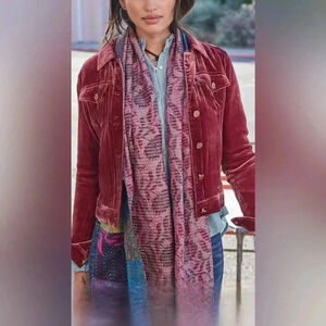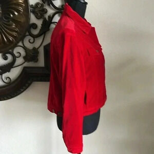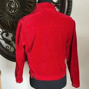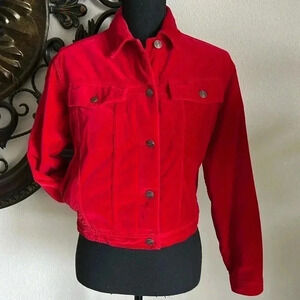 The Territory Ahead red velvet Jean jacket-style coat with 5 pockets, 4 outside and one inside pocket. Signature rivet closure. Size: Small. NWOT no holes or stain. **Styled on a size 4 mannequin**