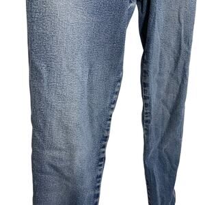 These are vintage high-rise straight leg blue jeans by The Territory Ahead for women in size 8 with a 34-inch inseam. The jeans feature a 5-pocket design with a button closure and a solid pattern. Made of spandex and cotton blend denim, they have a mid-rise waist of 29 inches. Perfect for summer, fall, and spring, these machine-washable jeans offer a regular fit and a classic style.