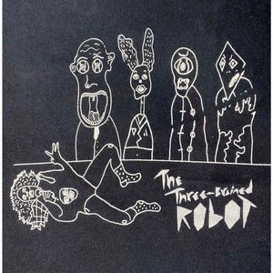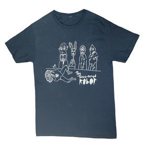 Black crew neck tee, short sleeves, white The Three-Brained Robot graphic on front, blank back