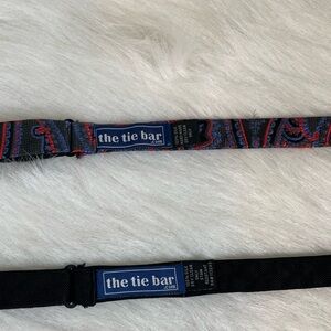 Elegant bow tie set from The Tie Bar. Includes a vibrant olive green and red paisley design and a classic black tie. No flaws. Adjustable. All silk