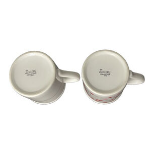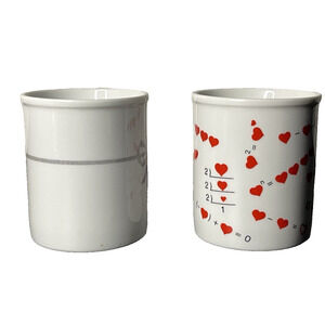 This unique set of 2 ceramic mugs from The Toscany Collection Japan features whimsical love-themed graphics, including red heart "math" equations and a sweet ribbon-wrapped heart on a crisp white base. These high-quality mugs are part of a collectible series known for playful, charming artwork and durable craftsmanship.