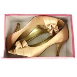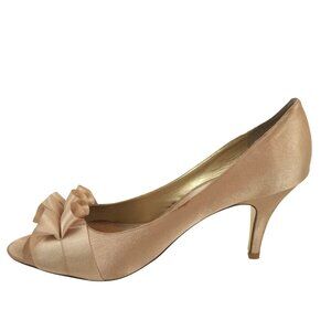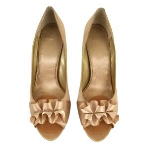 The Touch of Nina Gold Satin Peep Toe Ruffle High Heel Pumps