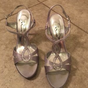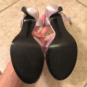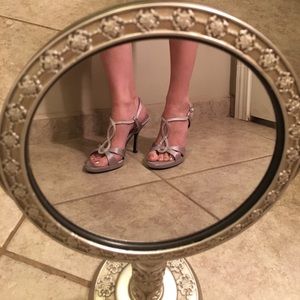 Silver heels with rhinestones, excellent condition only worn to a couple of small events. None of the crystals are missing, but you can slightly make out marks where my feet have been.