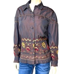 This jacket from the travel collection is a piece of art. The bottom and sleeves are masterfully crafted from the finest tapestry. See pictures for a look at the inside. Buttoned front