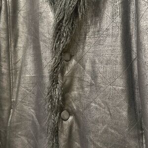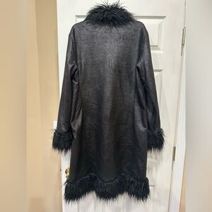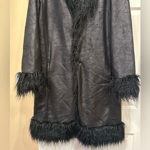• Black faux leather exterior with long faux fur trim at collar, cuffs, and hem
