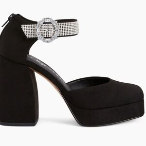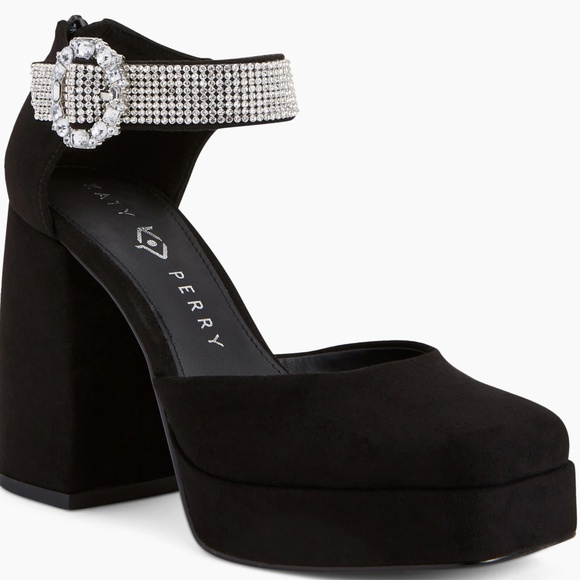 Sparkling embellishments decorate the instep strap and buckle of a retro-inspired square-toe pump lifted by a chunky platform and soaring block heel.