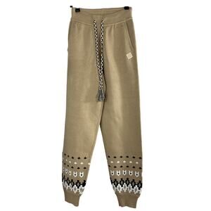 The Upside 'Fairbanks' Tan Cotton Jojo Knit Jogger Size XS: side seam pockets, ribbed cuffs trimmed with fair isle design, rubber arrow patch at front hip, soft knitted waistband with braided drawcord, measurements: 11 inch width x 38.5 inch length.