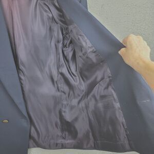 Double breasted navy blue classic blazer with gold buttons in 100% wool, size 10, vintage, from The Villager brand.
