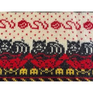 Vintage The Villager 100% wool sweater vest featuring a colorful Fair Isle knit pattern in cream, red, black, and yellow. (with black cats!) Classic V-neck pullover style with retro charm and soft midweight wool. Perfect for layering or adding a vintage statement piece to your wardrobe.