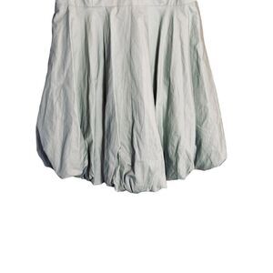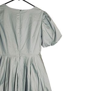 Elegant light gray dress with puff sleeves. V-neckline and flared skirt. Perfect for any occasion.