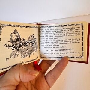 This is a vintage Christmas ornament featuring a real mini book of "The Wizard of Oz" by L. Frank Baum. The ornament is small in size, measuring 2.5 inches in height and 3 1/8 inches in width. It is made of cardboard, leather, and paper, with a multicolor design. Manufactured in 1984 by Kurt Adler, this ornament is part of a collection and has a mid-century style, making it a decorative and hanging piece for the holiday season. It shows pictures and tells a story.