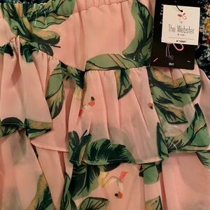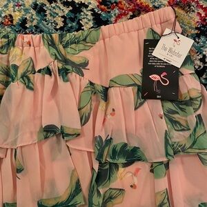 Brand New With Tags: The Webster Miami at Target Flamingo Print Skirt. Pink Tiered Skirt with Flamingo and Palm Leaf Print. Elastic Stretch Waist. Size Small (could also fit a medium). Excellent Condition.