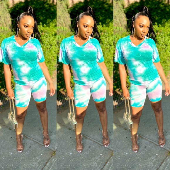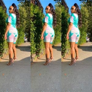 This Three piece set Short sleeve top and biker shorts has some stretch and also some see through but with the right garments under it will be fine. It also come with a fashion face mask that's washable and reusable. It's 95% Polyester 5% Spandex. Please Hand wash cold water only.
