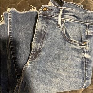 Chic ankle-length jeans with a distressed finish. Perfect for casual outings. Comfortable and stylish.