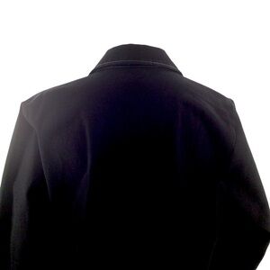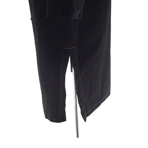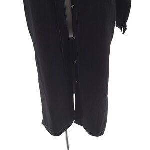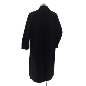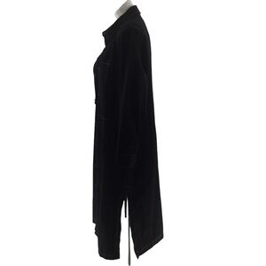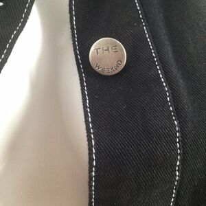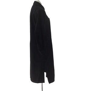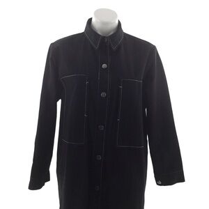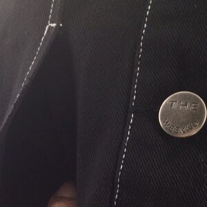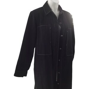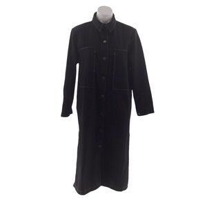 loose. Casual Streetwear, Hip Hop Jean overcoat, with Logo buttons on front and sleeve cuffs, two big patch pockets that open on the sides of the pocket, two side Deep pockets, large side slits, intentional fraying on edges. white contrast stitching around all edges, No size tag