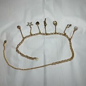 The first 3 charms (going from left to right) are a white pearl perched in a golden fan seashell, a golden 5-point Star charm, and a golden puffed heart charm. In the center is a golden lady charm with white cubic zirconia. To its right are a golden puka seashell charm, a golden female gender symbol charm studded with cubic zirconia, and a white faux pearl enclosed in a cut-out golden teardrop charm. This necklace has been newly handmade just for you.