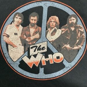 classic rock shirt, The Who tee, band t-shirt, vintage style tee, concert shirt, unisex rock tee, graphic music shirt, peace sign tee, retro rock apparel, collectible band merch, 2XL band tee, black cotton shirt, rocker look, 70s band style, men’s music tee