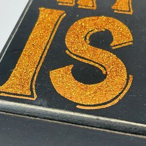 Pressed wood board sign measures about 7 X 10 X 1 3/4". Features orange glitter letters. Nice pre-owned condition.
