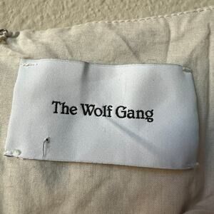 The Wolf Gang 'Feliz' midi dress in Ivory Polka Dot. Romantic and feminine, this off-the-shoulder cotton dress features a lace-up neckline, ruched puff sleeves, and a soft A-line silhouette. Size small – 17" pit to pit; 13.5" waist; 47" total length.