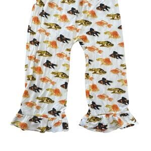 Adorable kids jumpsuit by Barefoot Dreams. Features a playful fish print. Ruffled sleeves and hems add charm. Perfect for casual wear.
