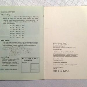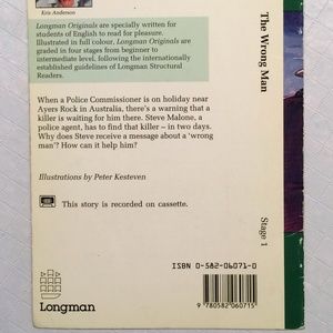 "Longman Originals" is a series of graded readers in four stages. All the stories are original - that is to say, written especially for the series. Originated from the "Longman Structural Readers", the series aims to offer a stimulating range of modern stories, including detective stories, adventure and romance. A stage 1 reader, this volume features a police commissioner on holiday near Ayers Rock in Australia. A warning is given that a killer is waiting for him there. Steve Malone, a police agent, has to find that killer - in two days. Then Steve receives a message about a "wrong man".