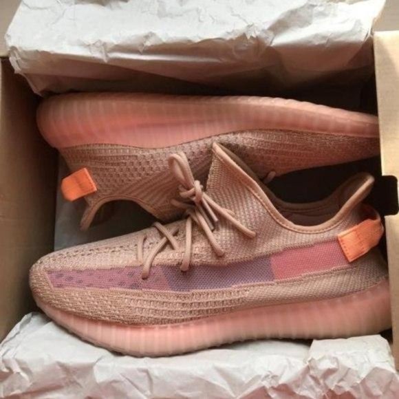 The adidas Yeezy Boost 350 V2 Clay is one of three regional exclusive colorways that released in March 2019. This Clay Yeezy released only in North America. The colorway features a reddish-orange color across the Primeknit upper with white detailing and matching clay-colored heel tabs. The translucent midsole has a slight gradient treatment in the same clay color. The construction also features the translucent monofilament side stripes seen on the other two versions in the regional Yeezy collect