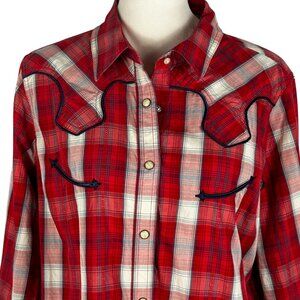 The best! Wrangler Retro Red, White, Blue Plaid Western Pearl Snap Shirt Sz M