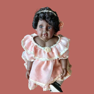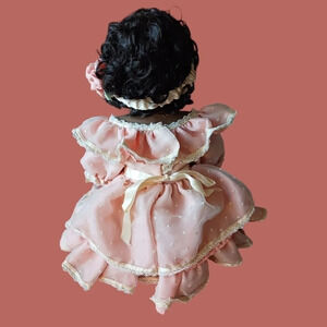 The collectables vtg This beautiful doll is dressed in a pretty pink dress, hairband, matches her dress and has a pretty necklace and black shoes She is a little heavy sitting and measures almost 16 inches. her name is Chantelle ,in excellent condition without box from smoke and pet free home.V044