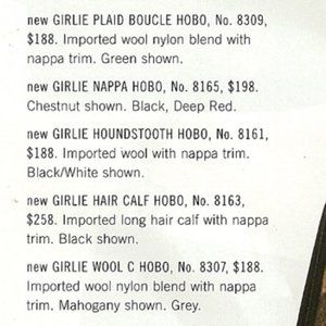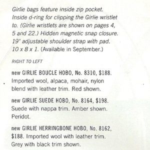 There are eight different types of Girlie bags, each one beautiful in its own way. Coach used different materials and colors to make a unique collection. The catalog scans list the bags from right to left. The following is from left to right: