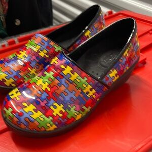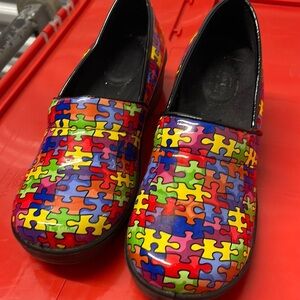 Like new clogs with puzzle pieces design .. no stains or rips... super cute