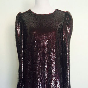 This Brand New form fitting Mini dress is surely a show stopper. It's a classy and yet flirty dress that will get you noticed in any party. The deep eggplant color shimmers in light and moves with you. Although a size S, a medium can wear it also.