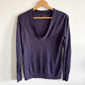 Dark purple lightweight v-neck sweater. Pretty stitching details. Soft and comfy. Made with a blend of merino wool and acrylic.