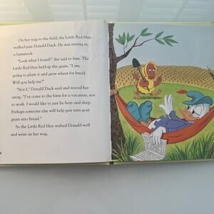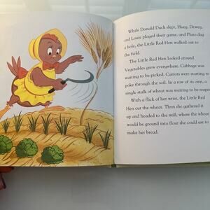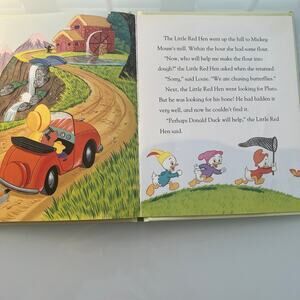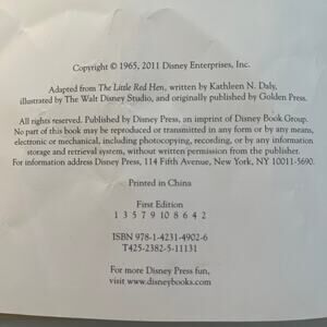 The little red hen by Disney press, New York, copyright 1965 and 2011. Includes great pictures of lovable Disney characters and a red hen and adventures with a lazy Donald Duck. Please reach out for additional questions or photographs. This is a hardback children’s book that is approximately 8 inches in height.
