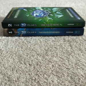 These are books one and two of the 39 clues series. Book one is written Written by Rick Riordan. Book 2 is written by Gordon Korman. Book one is the maze of bones and book 2 is one false note. Both are New York times best selling series books.