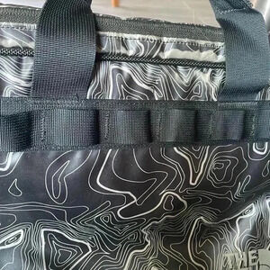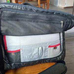 The north face laptop back, color purple cream, black, grey, north face logo has a bit peeling , otherwise great condition, measures 17X13