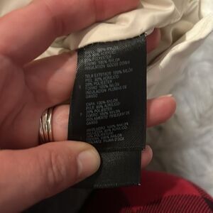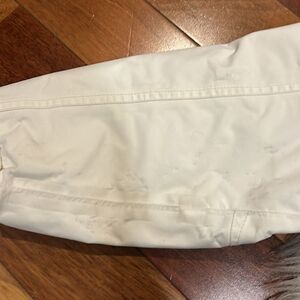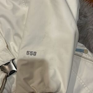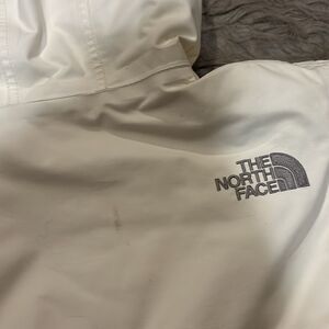The north face women’s white and gray logo belted nylon insulated winter jacket size medium, small stains on jacket as shown in multiple pictures