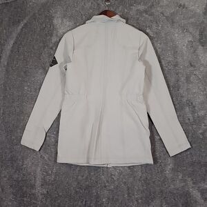 The North face long sleeve windwall full zip jacket size small. it's zipper n snap button closure..Has elastic rushing on the waist..only flaw it has small stain on the inside pocket. approx measurements pit to pit 17.5" length:28" ..