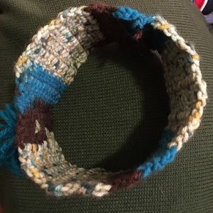 Multi colored handcrafted in blue, cream, brown with a knitted flower in blue. Stretches to fit most*