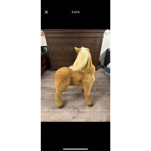 The product is a large Hasbro butterscotch FurReal Friends interactive animate ride toy featuring a horse pony design. This toy is part of the FurReal Friends character family, known for their electronic and interactive features. It is designed to mimic the movements and sounds of a real pony, providing an engaging and immersive play experience for children. The toy is in working condition, allowing for hours of imaginative play and interaction. One ear and the tail have been misplaced over the year. After market parts can easily be purchased if needed. Everything is still nice and very functional. She is huge!