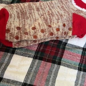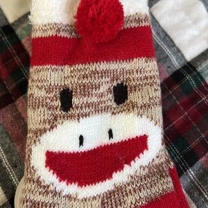 Unisex sock monkey design slipper socks, feature a soft, warm feel with foot grips for comfortable wear around the house.