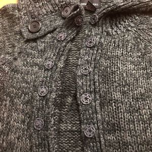 Adorable sweater! Long collar with 2 buttons, and 5 unique snaps. Front is a little longer than the back.