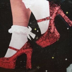 Rubies The Wizard Of Oz Dorothy's Ruby Slippers Size Small shoe size 5-6 Juniors/Ladies Platform Shoes with strap platform is 2" high with 5" heel ( heel would be like 3" high then) Red Glitter Shoe Halloween Costume